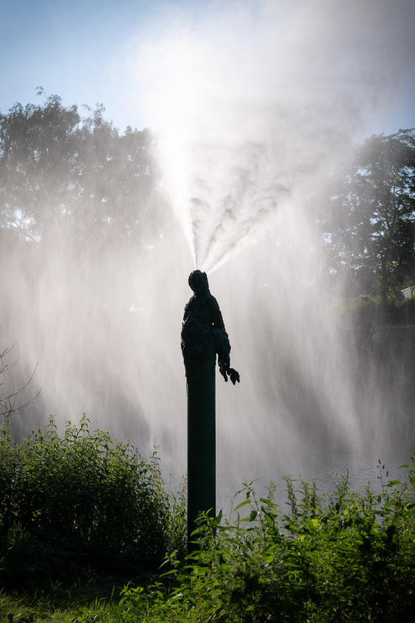 Als wäre sie soeben aus dem Fluss entsprungen, sitzt eine bedeckte Figur auf einem Pfahl zwischen den Büschen am Enzufer und blickt in den Himmel. Zur richtigen Tageszeit und bei geeigneter Sonneneinstrahlung sprüht die Skulptur einen feinen Wasserdunst in den Himmel und zaubert so einen Regenbogen über dem Fluss. Die mystische Figur mit den Hightech-Sensoren im Kopf ist aus Bronze gegossen. Sie erschafft ein ebenso wundersames wie vergängliches Bild, das eine Grenze zwischen Natur und Technik aufscheinen lässt.