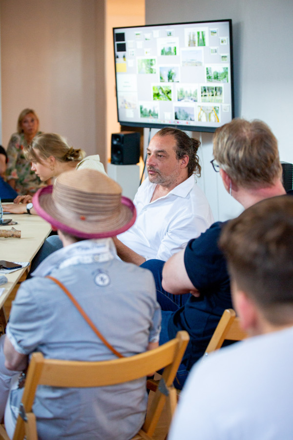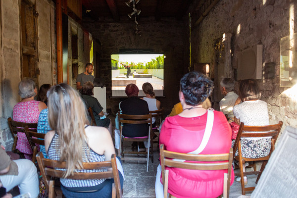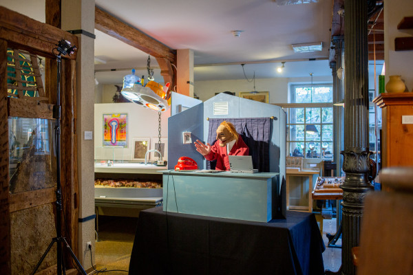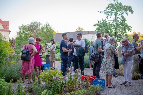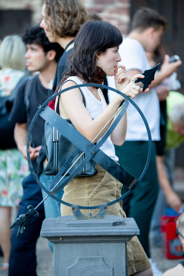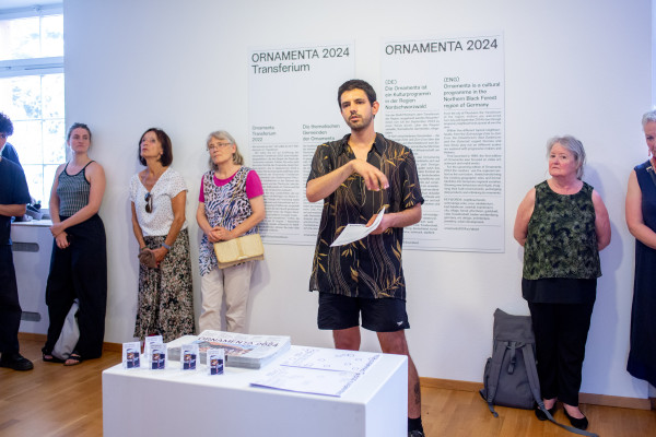 Raphael Mürle’s figure theater is ready to answer the phone for curious citizens of the Nord Schwarzwald-region. His attempt at translating the new symbolisms emerging in the sun valley into local dialects trigger awe and imagination in the audience. Then, we collectively activate the Transferium-audioguide in the exhibition spaces. We listen closely to Christine Lüdeke and Deniz Ova speculating on new grammars of conviviality in the thematic neighborhoods of Ornamenta. The area around Nord Schwarzwald is considered one of the most sun drenched regions in Germany. Hidden all over the region one will find different sun clocks decorating various façades of profane and sacred architecture dancing time with the sun. They seem nowadays like echoes from a past when timekeeping emerged from the interplay between natural cycles and sacred geometries which played a significant role in constructing social relations. As industrial society comes of age mechanic time-control machines, symbol of the new technocratic apparatus, move on to secular monuments and commercial spaces pointing to the emergence of a new linear progressive society. Sun clocks, now merely seen as architectural ornaments, slowly fade from their original function as media for a time-orientation which were tightly linked to planetary cycles and spiritual practices. As time-collapse moves forward in the Stadtmuseum the temporary Solartal community is faced with a choice between different temporalities and moving architectures. One group decides to join the speculative architecture project Bureau Babotanik, the other follows art-researcher, performer and writer Kiran Kumar into the Lapidarium, a collection of monumental fragments and grave stones in a barn next to the Stadtmuseum. Baubotanically built architectures manifest a new kind of cultural practice around botanical and interpersonal care in a mode of deep-time awareness. These green chronographs stretch and slow down our time perception as we observe year after year how care-intensive trees and human built structures grow together. These hybrid structures guide us to a new practice of more-than-human entanglements, stabilizing each other over time creating a stable ground for different life-forms. In the Lapidarium, on the other side, linear time is suspended while Kiran Kumar narrates his experiences during a strangely evocative visit to the Sun Temple in Konark in India several years ago. In a subtle but hypnotizing rhythm the audience follows his live archaeology as subtle but gentle entanglements emerge between dance and architecture, between embodiment and environment. Dancing between sacred architectures and sacred groves, a first attempt at articulating entanglements in artistic-ecological-spiritual practices is witnessed by the audience. The Solartal invites us to imagine sacred architectures and collective practices charging them with communal and re-generational capacities. How can we imagine our everyday practices as transactions with eternity, sustainably constructing a fertile ground for new types collective worship? What are future spaces where planetary dances and terrestrial choreographies meet art, science and the spiritual thus bifurcating into liberating templuralities?