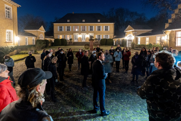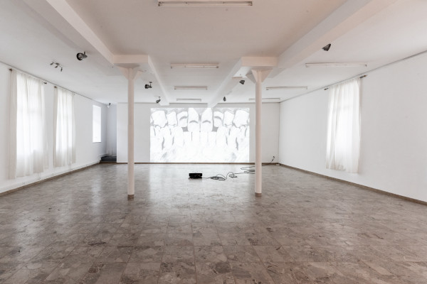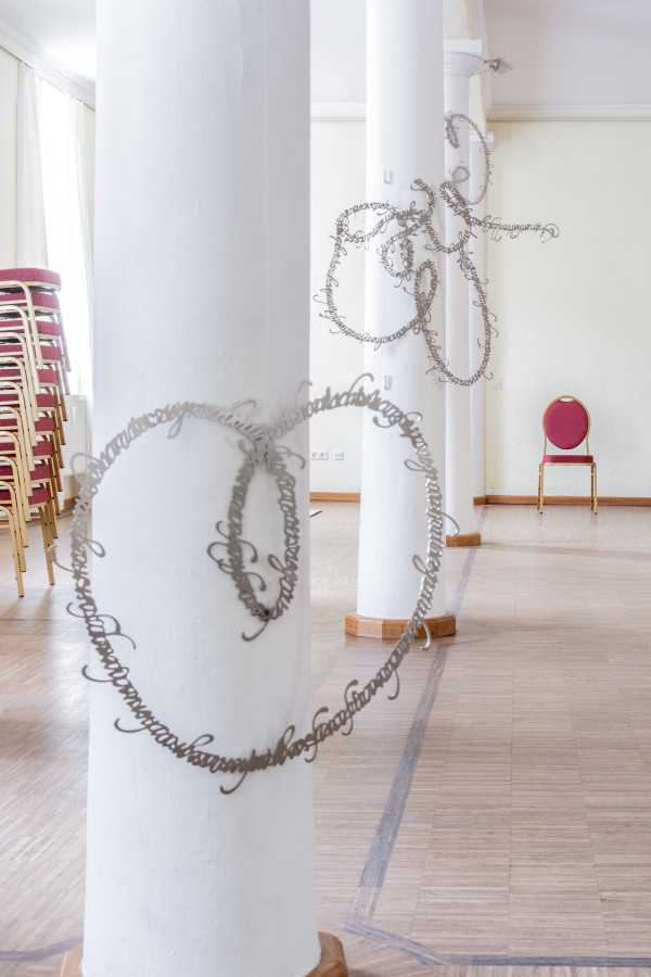 From this site below the ground the audience warms up their tongues during a bus drive with speech therapy performance and arrive at the Schloss Bauschlott, a castle renewed in the 19th century by architect Friedrich Weinbrenner, where we encounter a new video work and laser cutted metal sculptures. The human body is presented as a publisher. A thought is formed in the stomach, breathes it through to the chest and neck, which forms its timbre, and then moves through the vocal cords to form its pitch, into the mouth, where the tongue and teeth give its final texture and push the word outside the body, into the air.