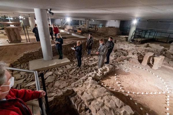 At the Roman city foundation ruins at Kappelhof in Pforzheim two works intervene in the historic site. A relief on a column and a floor installation formed by over thirty artificial teeth compliment the heritage in an ornamental manner. By juxtaposing letters, images, and objects the works of the artist turn into architectural sentences throughout the underground space.