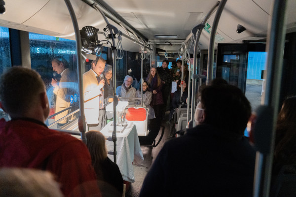 At our point of departure, Ben Epple presented modes by which to express contemporary forms of love through embracing certain aspects of tradition and collective desire. We asked how do we celebrate and profess different kinds of love with sincerity whilst taking pleasure in its ever-evolving form? There is an (im)possibility when trying to define what love is. Love can be something we feel, something we long for, something we give and something we receive, perhaps love is something we consume. After cruising through the streets we arrived at Technische Dienste Pforzheim where historian Helge-Marie Dilger shared narratives of intimacy in traditional German folklore. Then, we boarded with modern dandy Luis Ake who professed his love for love and invited us to share in consolidated heartache – where artefacts had moved across screens, smoke and water now performed an intimate metaphysical dance suggesting that history and the elements have something to tell us if we are only willing to listen. Before making our final departure and taking a leap of faith, Dutch artist Wouter Paijmans presented us with a series of ready-to-wear paintings dispersed around the terminus. Symbols of abandonment, redundancy, and reproduction connecting the relationship we have with mass consumption; love, desire, and the need to feel a sense of attachment to something… anything. Drawing the evening to a close, a thread of collective questioning emerged, do we really need to define what love is in itself, or is accepting its unknowability the way to intimacy? Love may not be the thing or object (of desire), but rather the transfer from one state (of being) to another?
