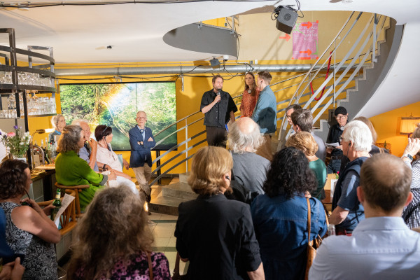The evening begins with a special video message from Claudia Roth, who serves as the Minister of State for Culture and Media. After that, there's a live panel discussion hosted by ORNAMENTA curator Jules van den Langenberg. During the panel, the artists Veronika Sedlmair and Brynjar Sigurðarson talk about how they're creating an artificial rainbow and what they plan to do next in its development.
