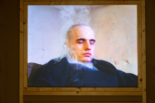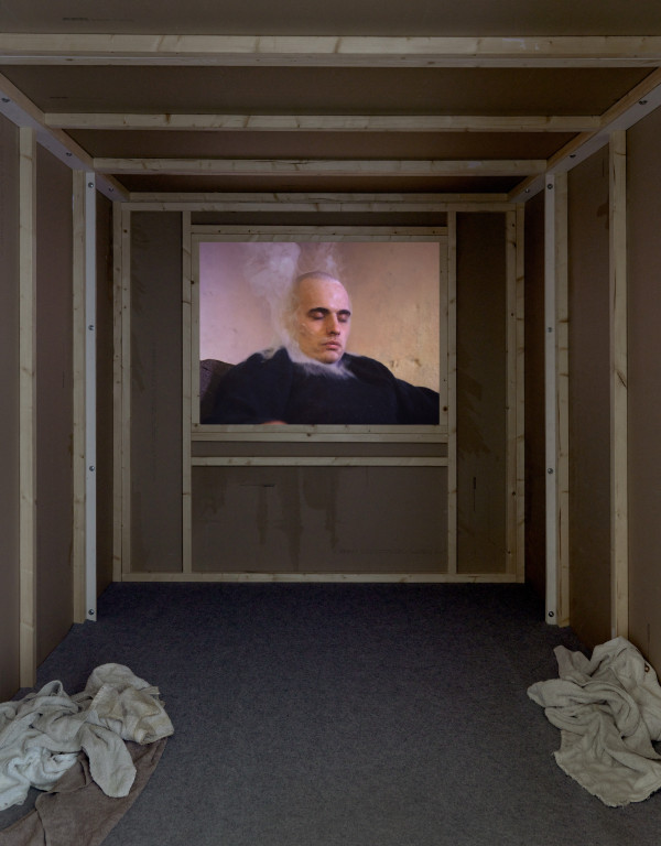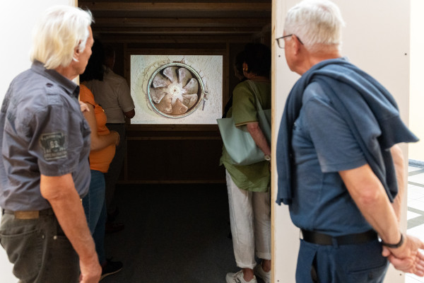 On the third floor of Ornamenta’s prologue exhibition inside project space A.K.T.; in Pforzheim, artist Minne Kersten installs a room filling sculpture as a preview to autonomous perspectives on sharing air in the context of ORNAMENTA 2024. It is an immersive work that revolves around evaporation and can be interpreted as fictional architecture. A rectangular block made of water damaged panels and rusted air conditioning units is accessible from one side. Inside, a video portrays an unpredictable body of water whose shifting and uncontrollable state seems to have prevented a disaster from being averted.