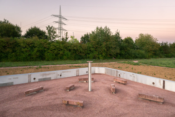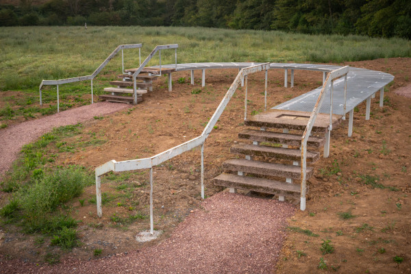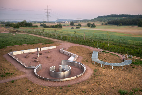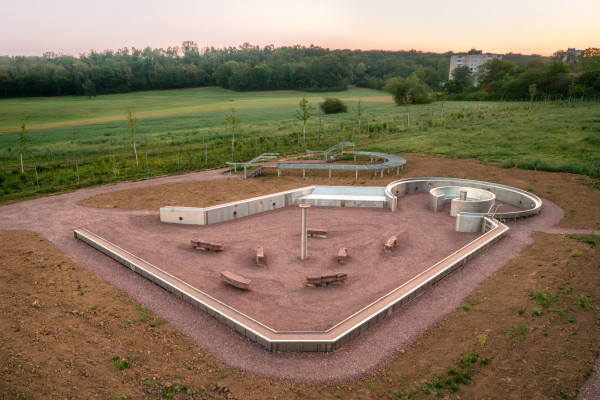 The "Inverted Paradise" is a public artwork situated at the intersection of a construction site and a picturesque natural landscape. Created by the public space based practice Spazio Cura, the work embodies their ethos of radically embracing the prevailing context and using minimal new materials to achieve maximum spatial impact. Thus, the artwork inhabits a previously overlooked space in Mühlacker, comprising abandoned regional architectural fragments, local leftover materials, and newly designed elements intricately woven together to form a new public site.