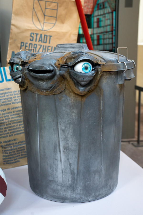 1.A. Museum of the Waste, Thomas Schütte | 1.B. Man Met Gorilla, Stephan Balkenhol | 2. Loan from National Cultural Institution (to be determined) | 3. Loan from Stadt Pforzheim Depot (To be determined) 4. Schüttung VIII (8), Manuela Tirler | 5. Monumenta – proposal for a public art work, Josse Pyl | 6. Justin the Dustbin, Bruno Baietto | 7.A Paper Garbage Bag, Stadt Pforzheim, | 7.B. Antique Dust Cleaner, Unknown | 7.C. Printing Plates, Unknown | 7.D. Table with Iron Cross, Unknown | 7.E. Doll House, unbekannt | 8. Ornamenta 1989 Guestbook from Pforzheim City Archive | 9. Pressed Second Hand Silver from Production Process, C. HAFNER | 10. Alte Zahnbürste, Bernhard Schobinger | 11. Tape Chair, El Último Grito | 12. Waste Collection Calender, Pforzheim | 13. Regional Building Project and Urban Development (To be determined) | 14. Alumni work from Hochschule Pforzheim (to be determined) | 15. basis.tunnel, Muhammad Müller