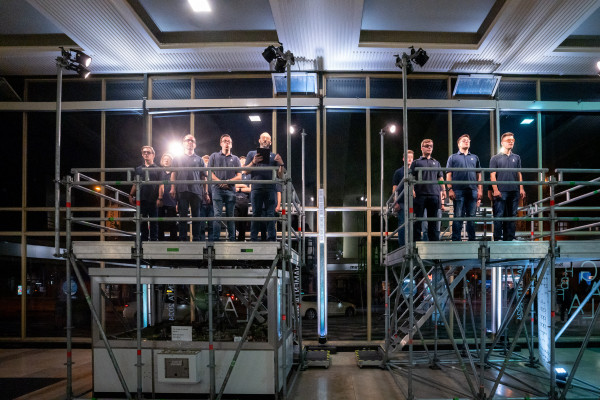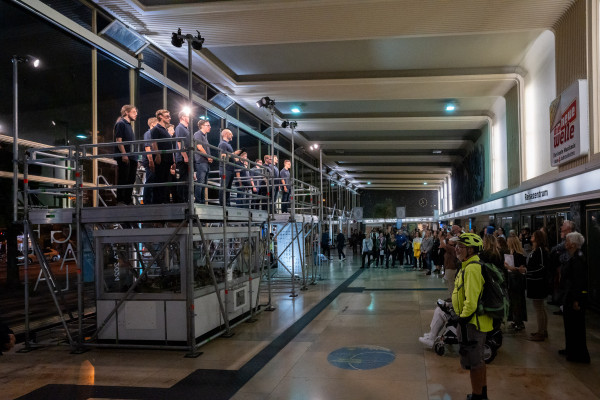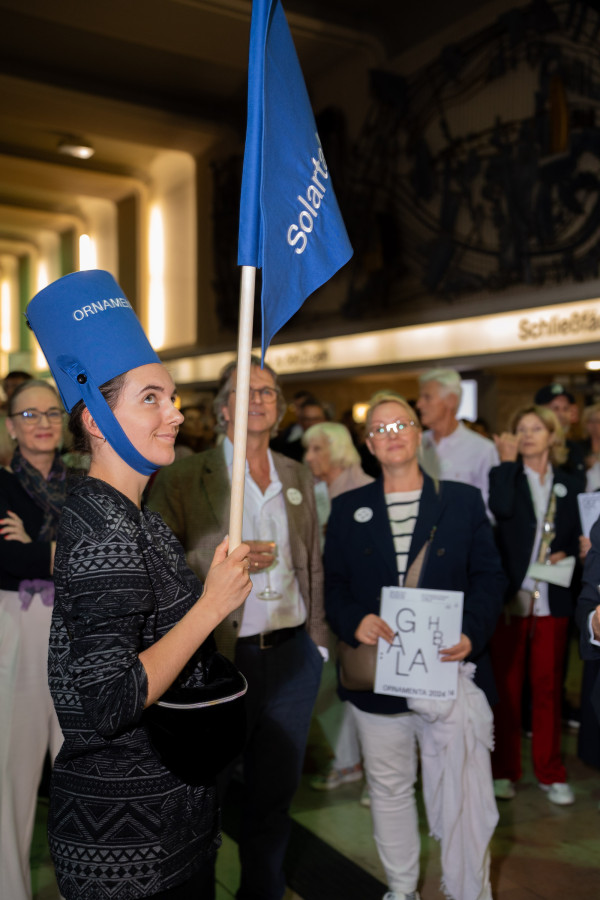 While the sun appears more frequently in the Northern Black Forest region, the future requires us to rethink our connections with it in innovative ways. Allowing the right solar elements to reaching our bodies and skin, opens up possibilities on the horizon for new devotions and sunny futures. In the Solartal plaza, on the constructed scaffolding above the model train, sixteen members of the Aurelius Boys' Choir from Calw pour their hearts into their singing. As they perform ‘Es löscht das Meer die Sonne aus’ (the sea extinguishes the sun) by Friedrich Silcher, each boy is adorned with a special piece of jewelry. The sunglasses from design studio buro Belén offer a new and stylish take on sun protection, enabling us to reformulate the relation to the center of our galaxy.