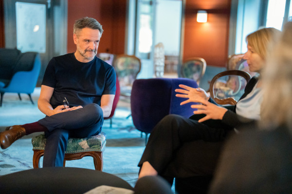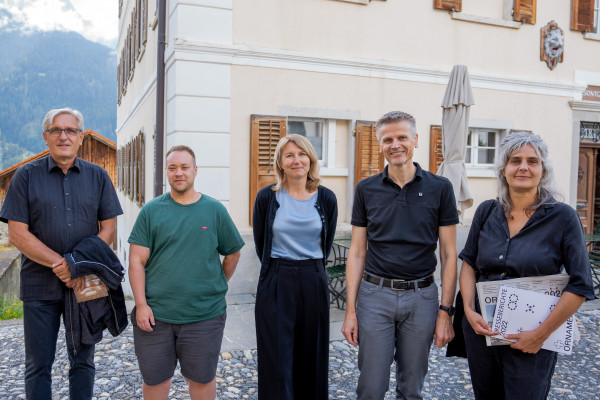 In Mulgens, a few kilometres away, another Origen building project is currently under construction - the Weisse Turm. Developed in collaboration with the ETH Zurich, another venue is being built in the immediate vicinity of the historic Weisse Villa in Mulegns, a community with a only dozen remaining residents. In the run-up to a lecture on the current status of the building project, the group met with the festival management. In the renovated rooms of the Weissem Villa, Ornamenta was presented followed by a discussion with the director, Dr. Giovanni Netzer, about development and cooperation possibilities.