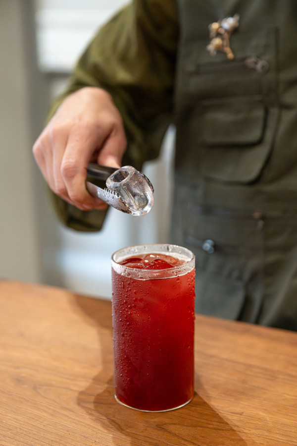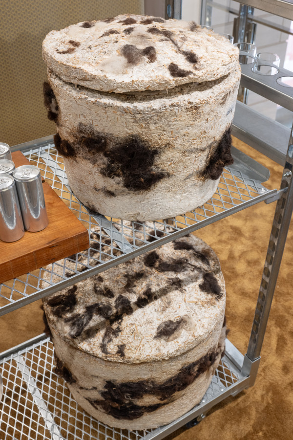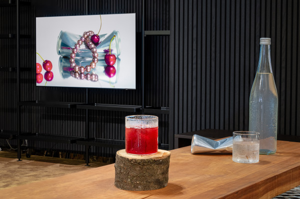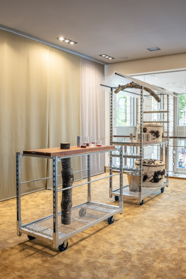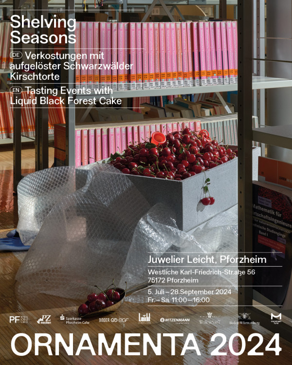 During the tasting events (first come, first serve), taking place at a high-end jewellery store Juwelier Leicht in the city centre of Pforzheim, small groups of visitors are welcomed to try out the liquid cakes from a custom-made cool box crafted from wool and mycelium; contemporizing traditional ecological knowledge. The event by food designers Philipp Kolmann and Suzanne Bernhardt advocates for a shift for retailers and bakeries: moving away from a culture of abundance and embracing seasonality, local preparation methods, and nearby ingredient sourcing. Instead they develop an even more contemporary product using overlooked but high-quality food materials such as cherry pits. The result is a newly made seasonal commodity: the black forest cake in the form of a cocktail, with a longer shelf life than any fresh cake.