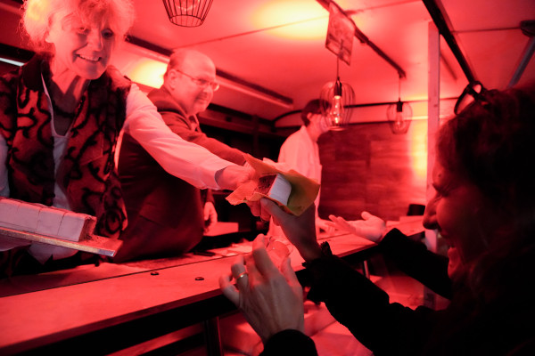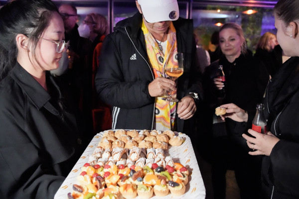 The railway station serves as the terminal from which we depart and to which we arrive: the liminal space between where we are going and where we have been filled with consumerist waypoints for pulp fiction, fast coffee, and fashion accessories. Our physical journey rarely stops when we arrive as our gaze is diverted towards information boards for the next transfer as we look for connections or other modes of transport, or even simply heading out on foot heading making our way towards territories of familiar unfamiliarity, but what if the journey continued without leaving the terminus? Can we still conjure up the sense of advancement and travel while remaining fixed to the station’s specific set of geographical coordinates? The Ornamenta Gala asked its audience to take a moment to pause and reflect, using the immediate space of Pforzheim Hbf to become a window to other subjectivities that transport those that give over to the idea of going nowhere while being somewhere. Colophon: Gala Venues: DB Station&Service AG, Vivo Bar Food truck: La Signora, Catering: Comedia, Vivarepas, Panificio S. Calogero, Snack Insects, Eksi’s Motivtorten Printing: Druck+Medien Pforzheim Banners and Fencing: Technische Dienste Stadt Pforzheim Hair and Make-up: Friseur barbers – Stephan Hochstein & Andreas Klug GbR Gala Backstage Venue: Schlosskeller Privatbrauerei Wilhelm Ketterer Water Display Bad Databrunn: Bad Liebenzeller Mineralbrunnnen Crockery: Parkhotel Pforzheim GmbH Produktionsmanagement: Andreas Schmidt Art handling: Richfelder AV- Media: multi-media systeme AG Light: David Horn Scaffolding: dp-showtechnic GmbH & Co. KG Fireworks:MK-Eventdesign Gala Hosts: students and members of local organisations and youth groups (Queer Space Pforzheim, Internationaler Beirat, HS Pforzheim, KIT Karlsruhe) Copywriting and Translation: David Cross Kane and Merit Julia Sauter Graphic design: OPSXD Typefaces: Charlotte Rohde Photograpy: Karolina Sobel, Marta Bogdanska