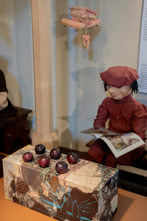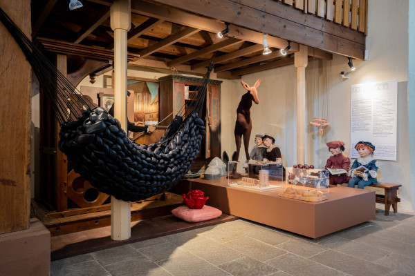 1.A. Swing, Ulrike Rehm | 1.B. Slow Shadows, Jens Pfeifer | 2. Loan from National Cultural Institution (to be determined) | 3.A. Rose auf Kissen, Vito Pace | 3.B. Bambi, Else Bach | 3.C. Wickelkind, Karl Albiker | 4. Schnecke, Iris Henkenhaf-Stark | 5. Proposal for public artwork in Pforzheim (to be determined) | 6. Dwarf Parade Dog (Plum Nipples), Kasper Bosmans | 7.A. Bridal Wreath in Frame, Unknown | 7.B. Bauernschrank II, “Margareta 1813” | 8. Film Reel, Kommunales Kino Pforzheim | 9. Black Forest Gateau, Tourismusbüro Pforzheim | 10. IKON, Niklas Link | 11. BLESS N°28 Climate Confusion Assistance Fatknit Hammock, BLESS | 12. Documents of Contemporary Everyday Life in the Northern Black Forest (To be determined) | 13. Modell CARL, Arlinger Baugenossenschaft | 15. rose-eros, Timm Ulrichs